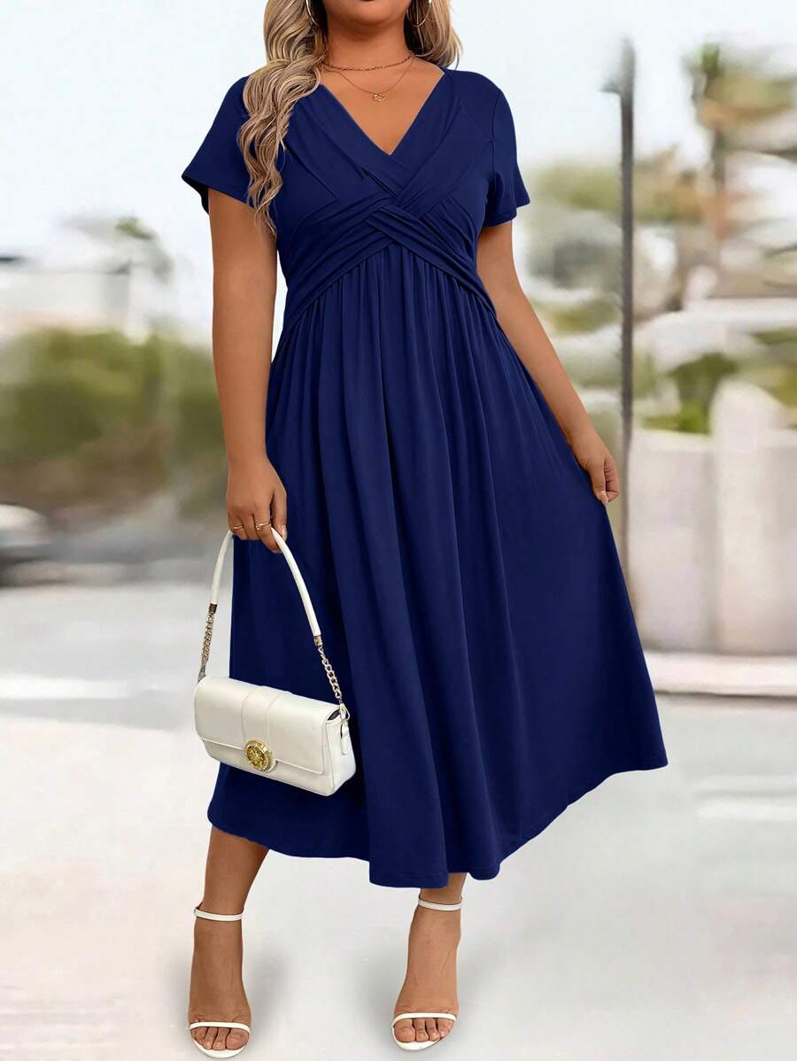 Projekt: Sukienka letnia Plus Size z kieszeniami ma atrakcyjny, kopertowy krój z dekoltem w serek i wysoki, ściągaczowy stan, który modeluje elegancką sylwetkę klepsydry. Jej krój w kształcie litery A delikatnie podkreśla figurę i kończy się lekko rozszerzanym dołem, który zapewnia płynność ruchów, a dyskretne kieszenie boczne i subtelne szwy dodają praktycznego, nowoczesnego charakteru.