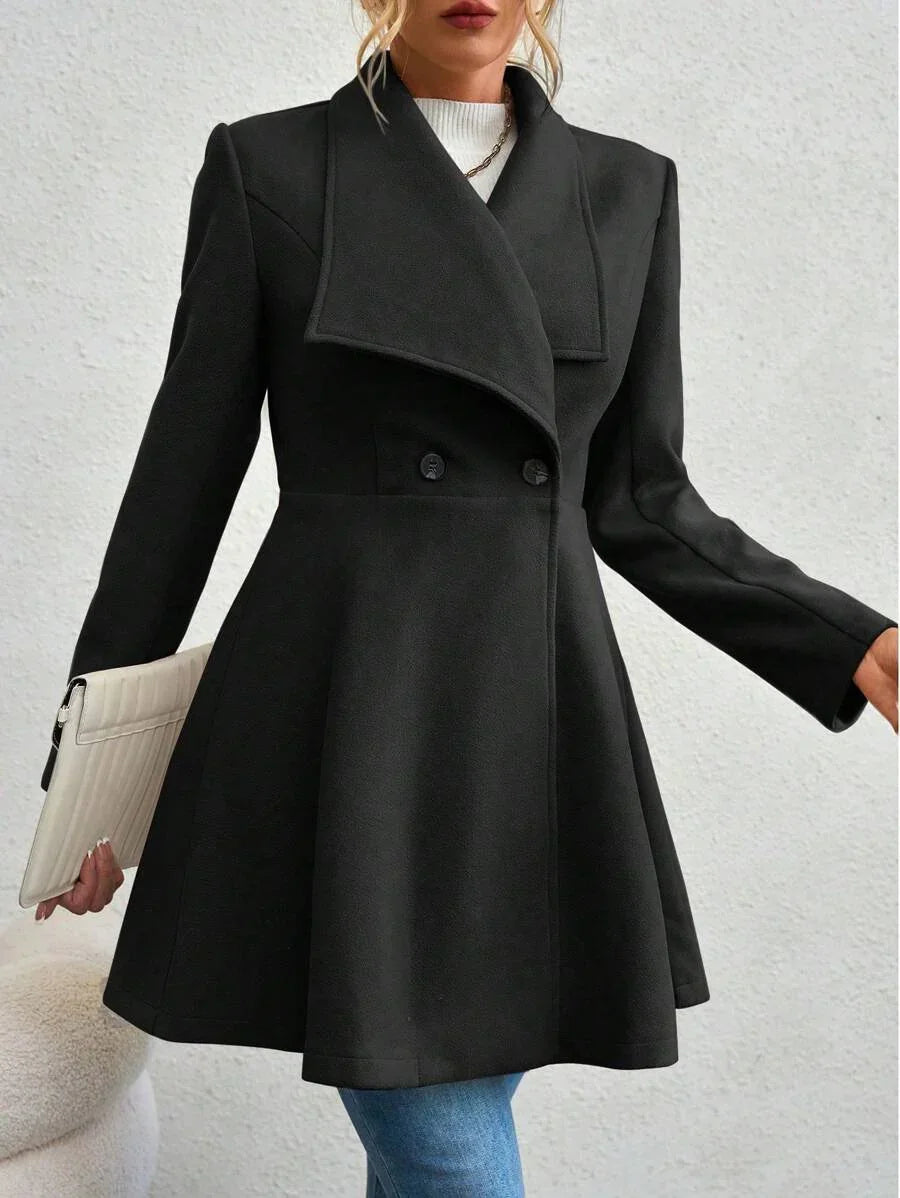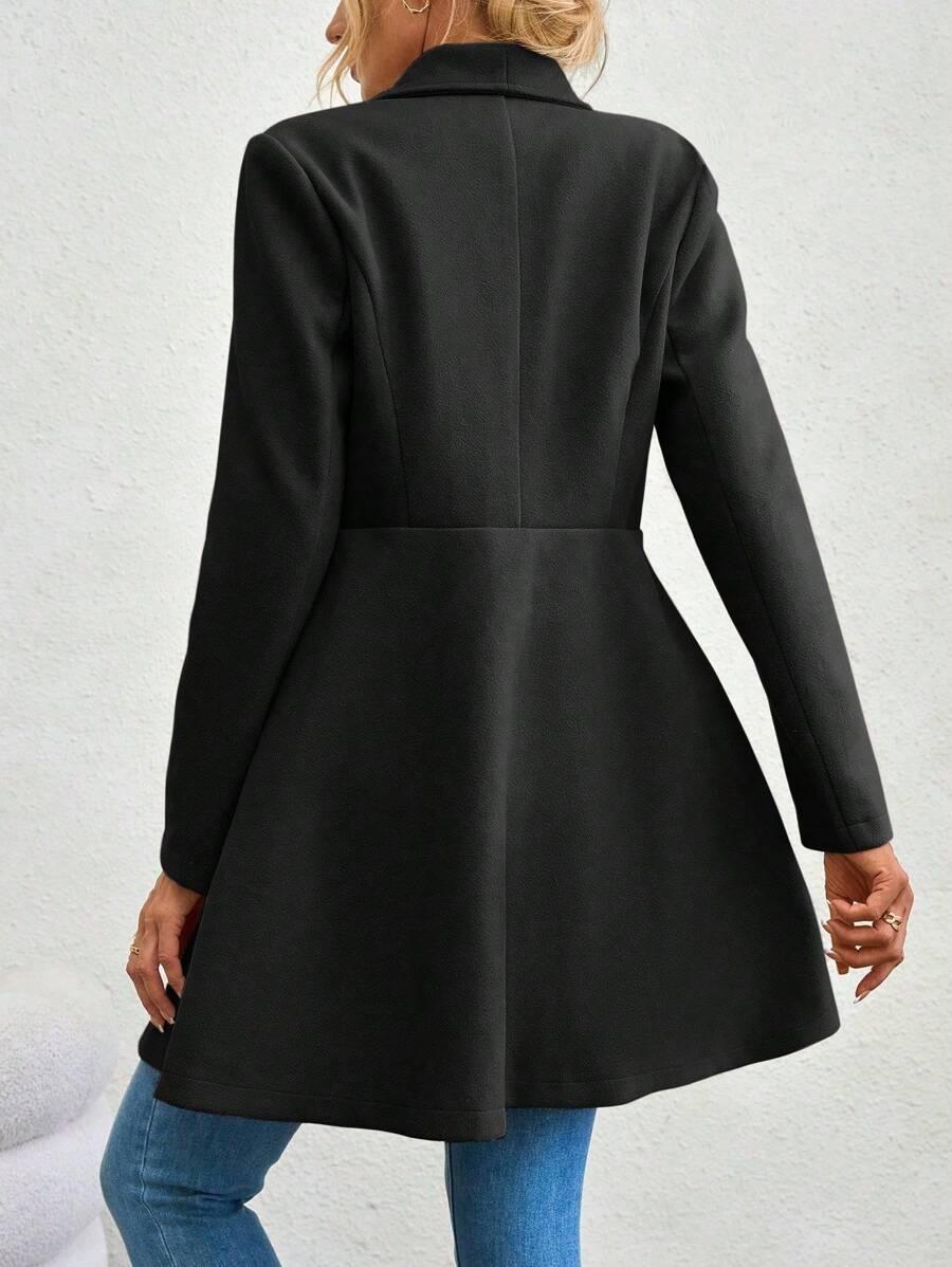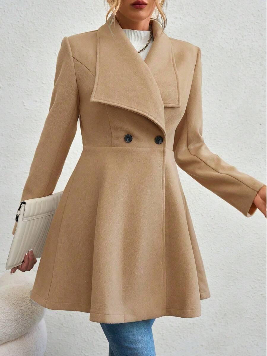 A lightweight knitted blend jacket in khaki offers timeless elegance with a touch of quiet luxury. The cinched waist creates a chic, minimalist silhouette that flatters every frame. Features include a waterfall neckline, a double-breasted placket, long regular sleeves, and a flared hem that moves with you. The plain pattern and unlined body keep the look refined and versatile, perfect for old money style and minimalist fashion.