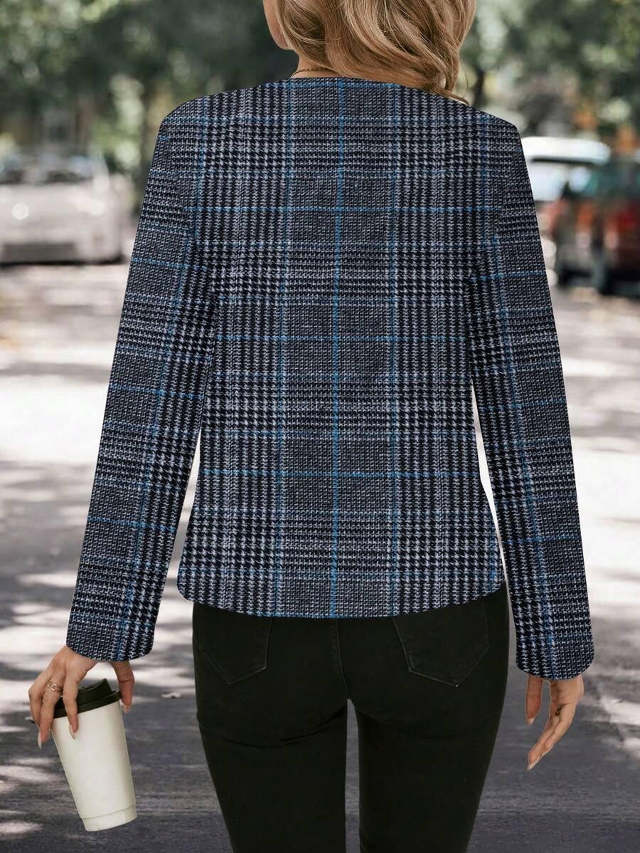 Timeless plaid woolen jacket featuring a round neck and long sleeves. The unlined body and regular hem create a quiet luxury, minimalist silhouette that feels refined and effortless. The multicolor plaid adds a touch of old money style, keeping it versatile for chic outfits. A single-breasted placket with button closure completes the elegant, regular-sleeve design.